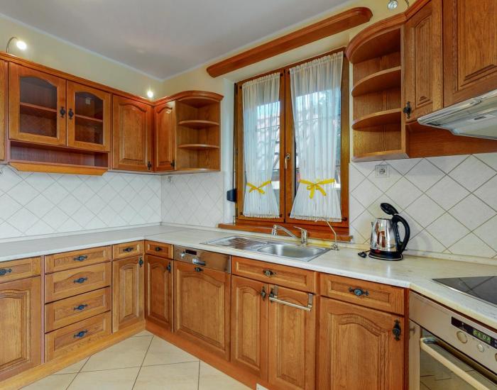 Veľká, priestranná obývacia izba s predprípravou na kuchyňu, 3 samostatné izby, kúpeľňa so sprchovacím kútom, vaňou, umývadlom, WC a bidetom.