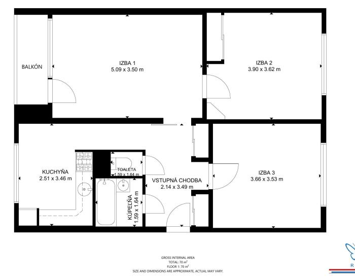 dispozícia: predsieň, kuchyňa, priechodná obývačka, dve samostatné izby, kúpeľňa, toaleta