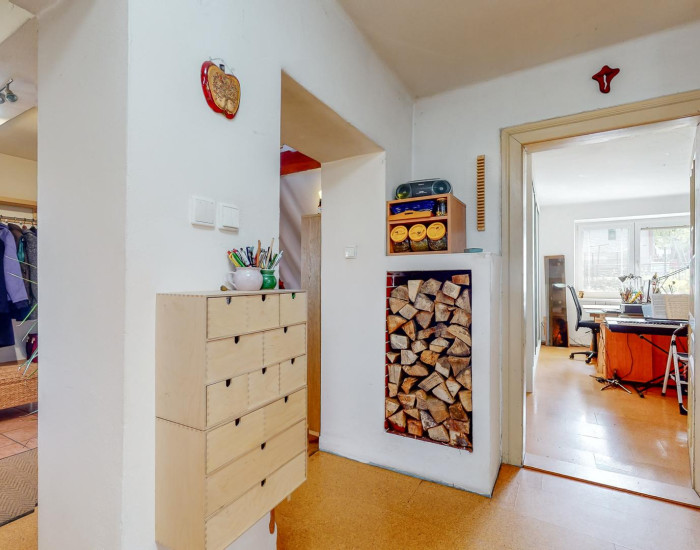 Priestranná obývacia izba s krbom spojená s kuchyňou, s východom na terasu, takisto aj z kuchyne je východ na terasu, s jedálenským kútom, 3 samostatné izby , kúpeľňa , samostané WC, vstupná priestranná hala so schodami do podkrovia, pivnice, vstup.