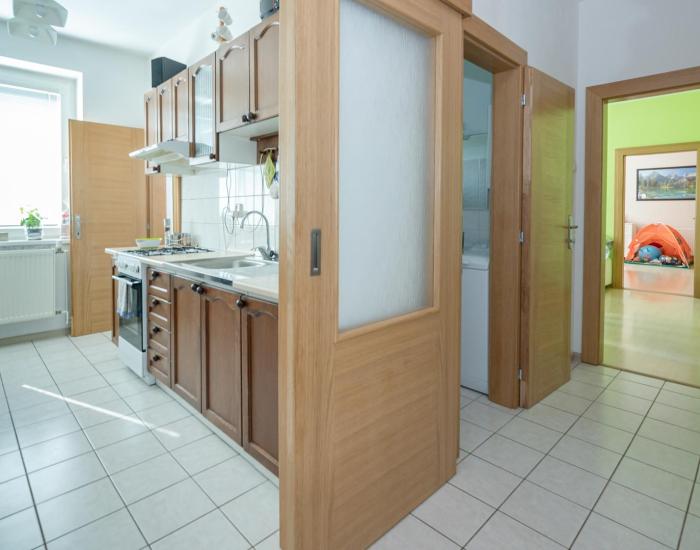 V izbách, v kuchyni a chodbe plávajúca podlaha v kúpeľni dlažba.