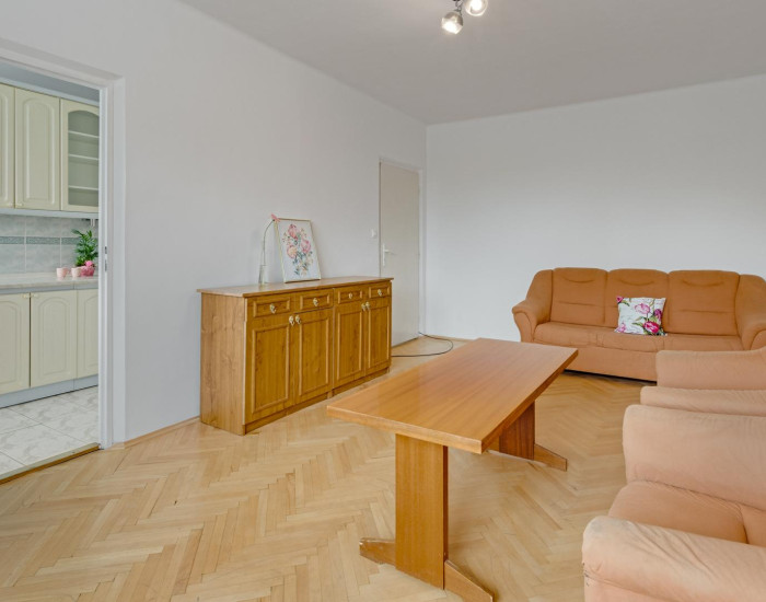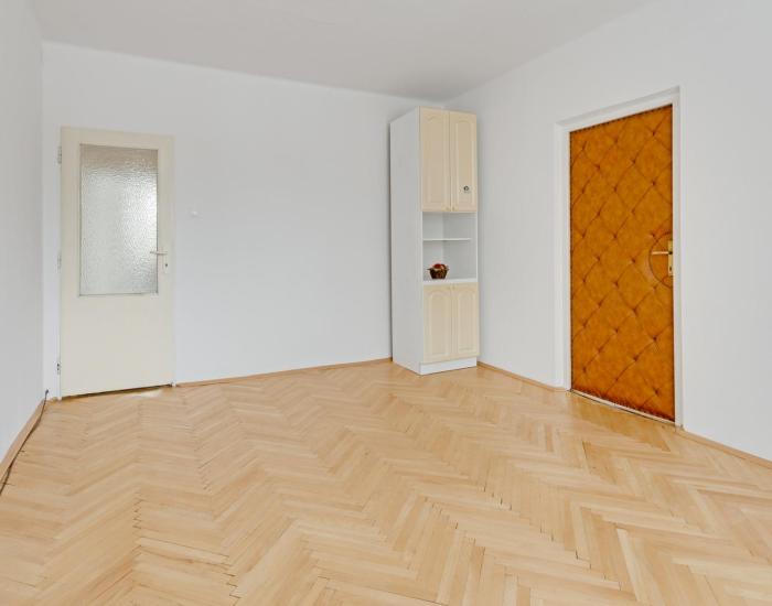 Vstupnú časť bytu tvorí priestranná predsieň so vstavaným šatníkom. Po pravej strane je L-ková kuchyňa so vstupom do kúpeľne s vaňou. Samostatná toaleta má prístup z predsiene. Do priestrannej obývačky sa vstupuje z predsiene aj z kuchyne, čo umožňuje v prípade potreby predelenie na dve samostatné menšie izbičky. Detská izba a spálňa sú priechodné. V spálni je vstavaný šatník. V predsieni, v kuchyni, v kúpeľni a na wc je dlažba. V obytných miestnostiach sú veľmi pekné pôvodné parkety.