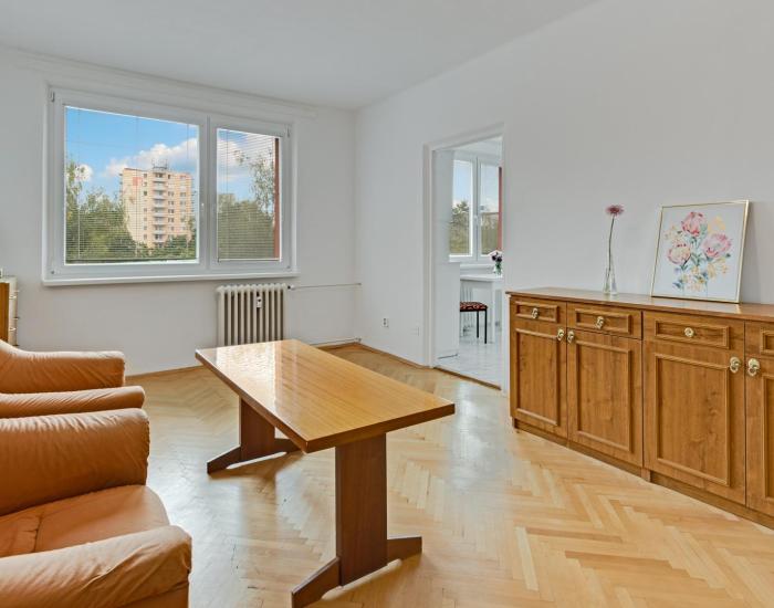 Vstupnú časť bytu tvorí priestranná predsieň so vstavaným šatníkom. Po pravej strane je L-ková kuchyňa so vstupom do kúpeľne s vaňou. Samostatná toaleta má prístup z predsiene. Do priestrannej obývačky sa vstupuje z predsiene aj z kuchyne, čo umožňuje v prípade potreby predelenie na dve samostatné menšie izbičky. Detská izba a spálňa sú priechodné. V spálni je vstavaný šatník. V predsieni, v kuchyni, v kúpeľni a na wc je dlažba. V obytných miestnostiach sú veľmi pekné pôvodné parkety.