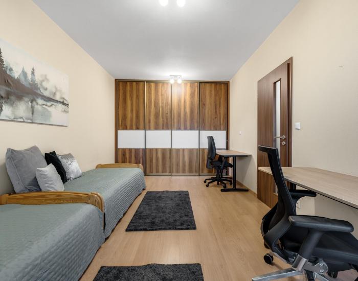 Príjemný 3i byt je dobre dispozične riešený. Pozostáva zo vstupnej haly (6,08 m2), obývacej izby (20,44 m2) s kuchynskou časťou (5,18 m2), spálne (15,04 m2), samostatnej izby (19,55 m2), kúpeľne (4,55 m2) a samostatného WC (1,80 m2).