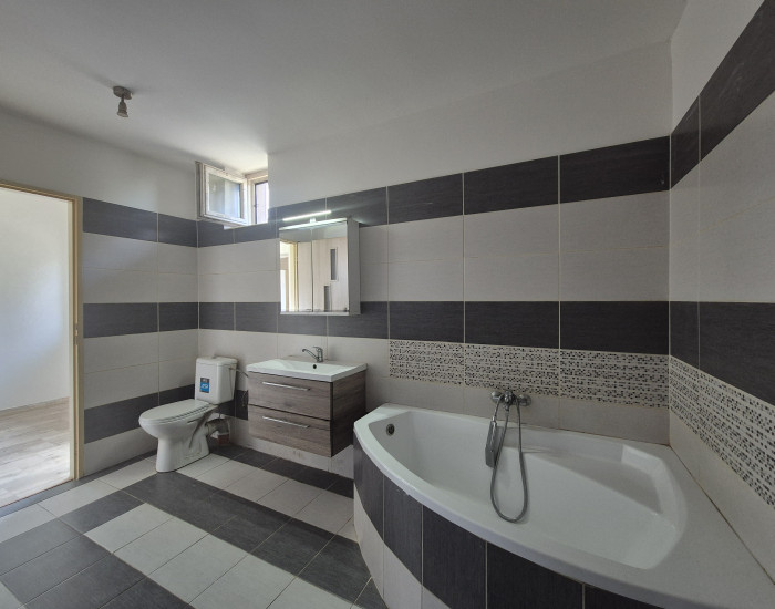 Dispozícia domu je premyslená a praktická. Vstupná chodba vás privíta a vedie do kuchyne, kúpeľne s WC a priestrannej izby, z ktorej sa dostanete do dvoch ďalších izieb. V jednej z izieb je prístup do kotolne, čo zaručuje pohodlné a efektívne využitie priestoru a do ďalšej izby. Celková úžitková plocha domu, vrátane terasy, dosahuje 155,84 m2, pričom terasa s rozlohou 31,61 m2 je ideálnym miestom na relaxáciu a rodinné stretnutia.