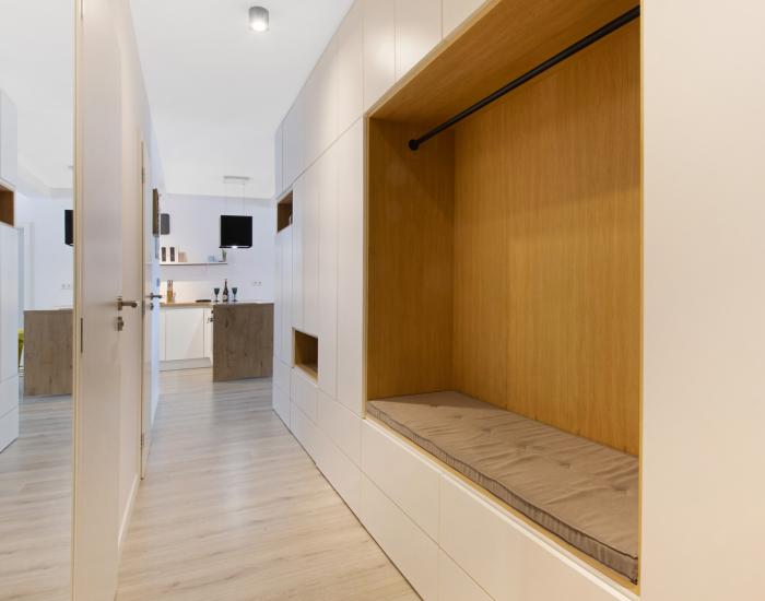 dispozičné riešenie: predsieň, kuchyňa s obývačkou, spálňa so šatníkom, pracovňa s balkónom, kúpeľňa s vaňou, toaleta, šatník, balkón, pivnica, parkovacie státie