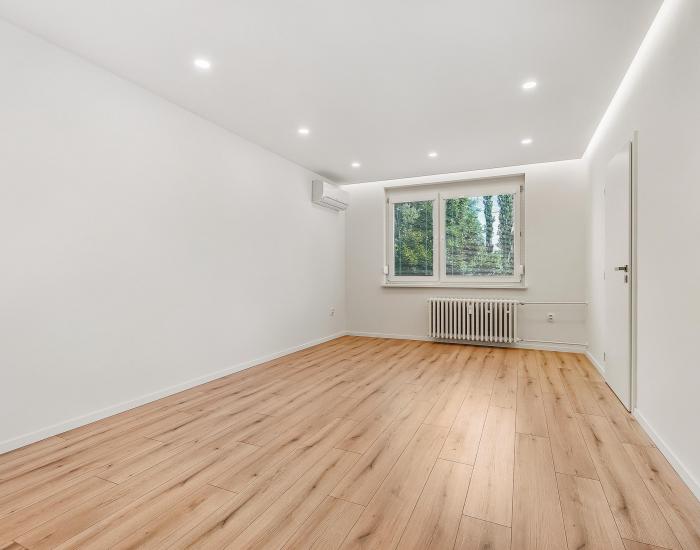 Vybavenie: kompletne zariadená kuchyňa (chladnička, rúra, varná doska, digestor, mikrovlnka, umývačka riadu), vstavané skriňe v obývačke a spálni, botník a police na mieru v komore