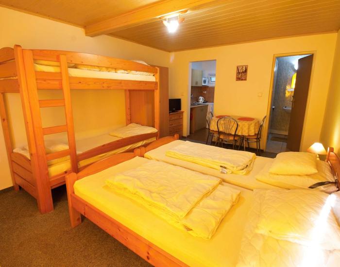 Samotný penzión je plne rekonštruovaný a ponúka apartmánové ubytovanie. Všetky apartmány sú vybavené vlastným sociálnym zariadením, kuchynkou a modernými technológiami ako satelitná TV a wifi. Na prízemí sa nachádzajú tri štvorposteľové apartmány a v podkroví štyri dvojposteľové apartmány, pričom maximálna kapacita je 20 osôb. Dvojposteľové apartmány s balkónom sú ideálne pre rodiny, zatiaľ čo štvorposteľové apartmány sú priestranné a vhodné aj pre menej pohyblivých hostí. Každý apartmán má prístup na terasu, ktorá je skvelým miestom na posedenie pri raňajkách alebo večeriach.