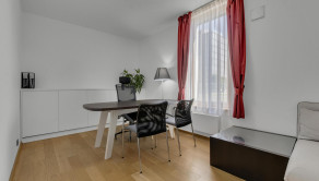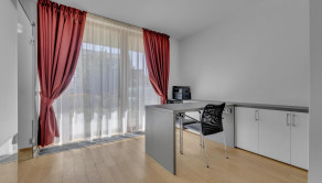Byt zaujme veľkými drevenými oknami z trojskla, ktoré prepúšťajú množstvo ranného slnka vďaka východnej orientácii, no zároveň výborne izolujú hluk z Tomášikovej ulice.