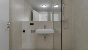 Kúpeľňa nebola nikdy používaná. Kúrenie zabezpečujú biele doskové radiátory v kombinácii s podlahovými konvektormi.