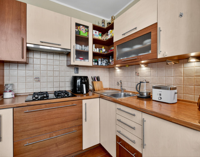 Byt má praktické dispozičné riešenie. Pozostáva z obývacej izby, samostatnej kuchyne, spálne, dvoch nepriechodných izieb, vstupnej haly, kúpeľne a samostatného WC. Zo spálne sa vychádza na zasklenú loggiu so stropným sušiakom (švédsky systém).