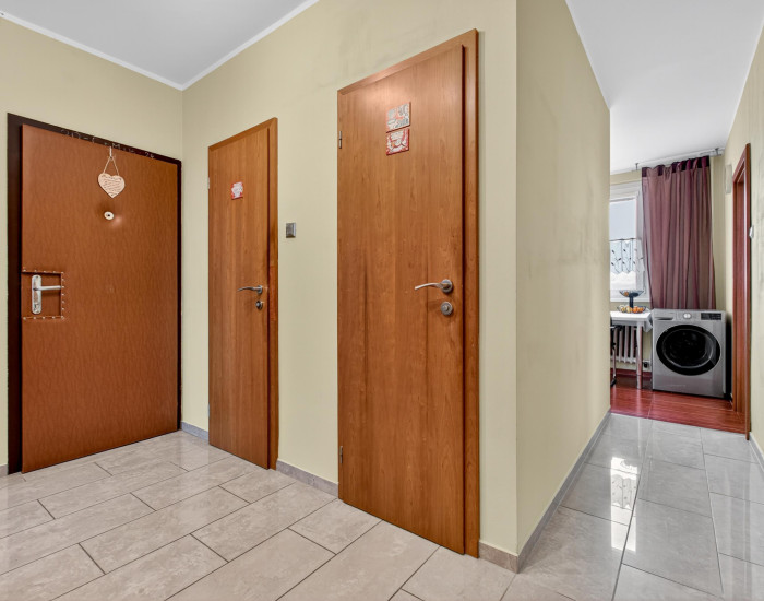 Byt má praktické dispozičné riešenie. Pozostáva z obývacej izby, samostatnej kuchyne, spálne, dvoch nepriechodných izieb, vstupnej haly, kúpeľne a samostatného WC. Zo spálne sa vychádza na zasklenú loggiu so stropným sušiakom (švédsky systém).
