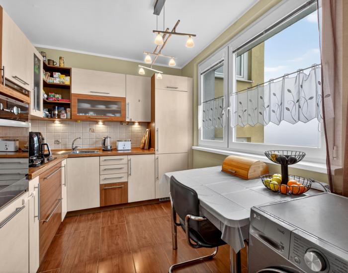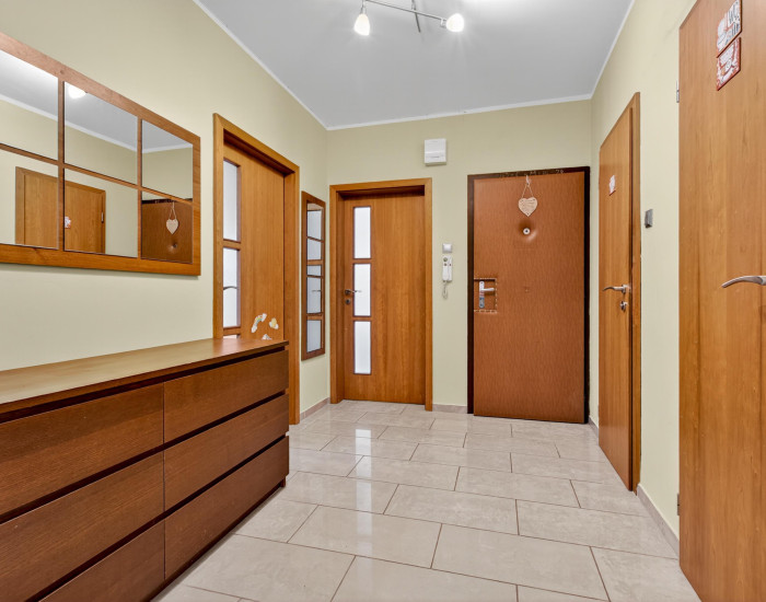 Byt má praktické dispozičné riešenie. Pozostáva z obývacej izby, samostatnej kuchyne, spálne, dvoch nepriechodných izieb, vstupnej haly, kúpeľne a samostatného WC. Zo spálne sa vychádza na zasklenú loggiu so stropným sušiakom (švédsky systém).