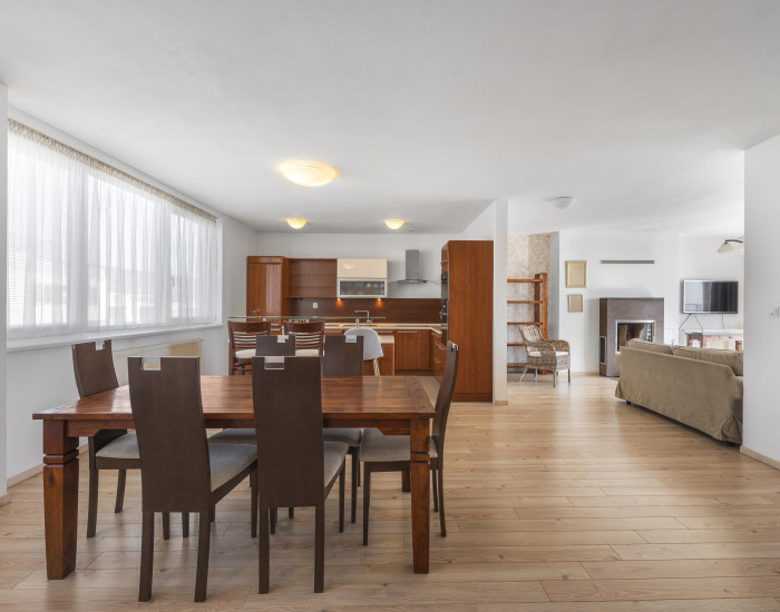 Butterfly-reality is proud to offer exclusively on behalf of the owner this beautiful and spacious 4-bedroom duplex apartment with two terraces, a fireplace, and a garage parking space, located in the quiet and green Slanec area of Krasňany, Bratislava.