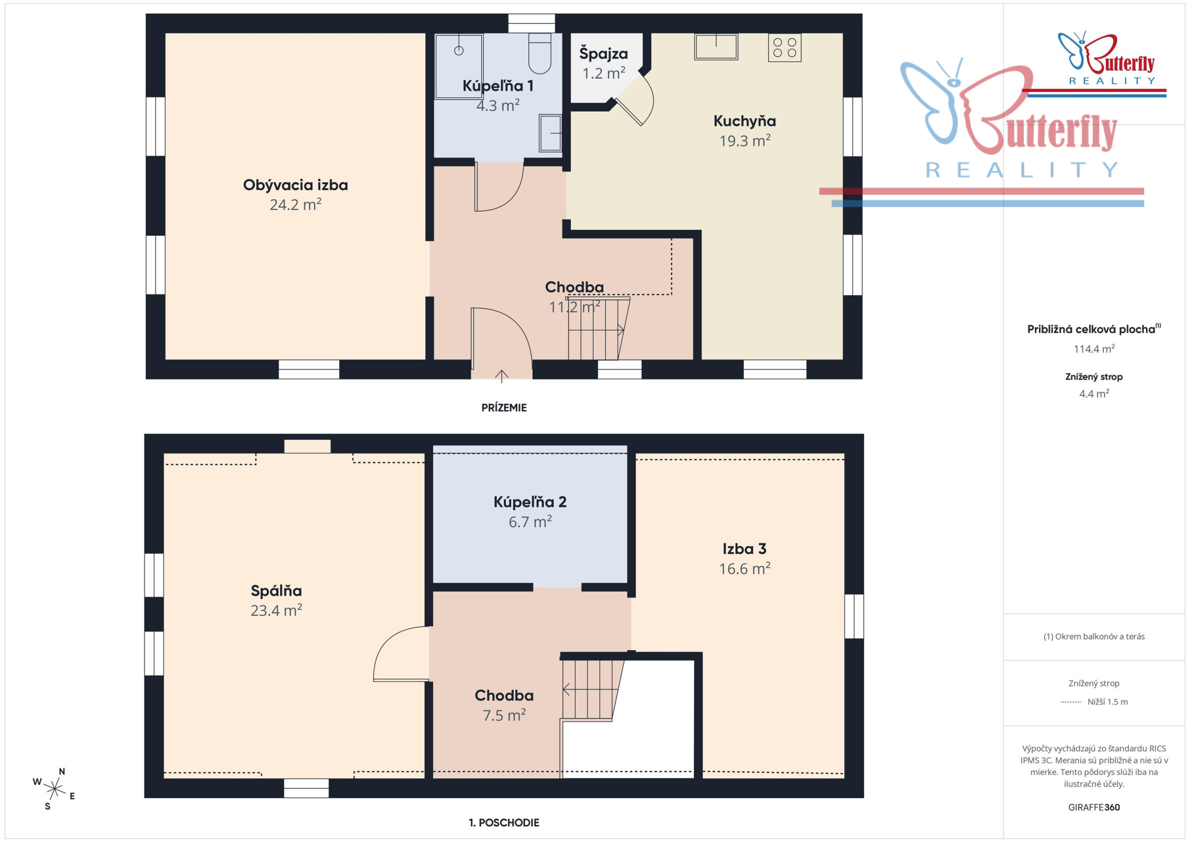 obytná plocha: 114 m2 (prízemie: 59,60 m2, podkrovie: 54,70 m2)